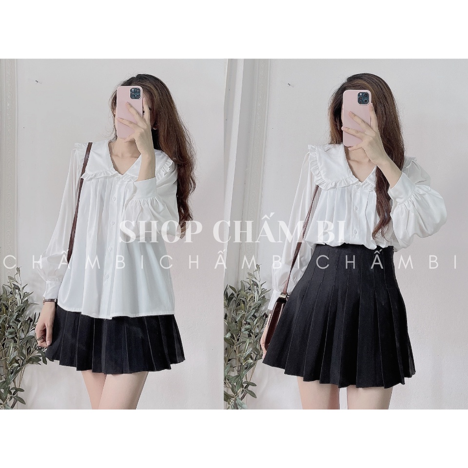 Freeship- Áo Babydoll Dáng Xòe Xếp Ly 3 Hàng Dọc Ngực Cổ Bèo Sen To Dài Tay Cài Cúc Vải Thô Lụa - A.145 mua tại đây