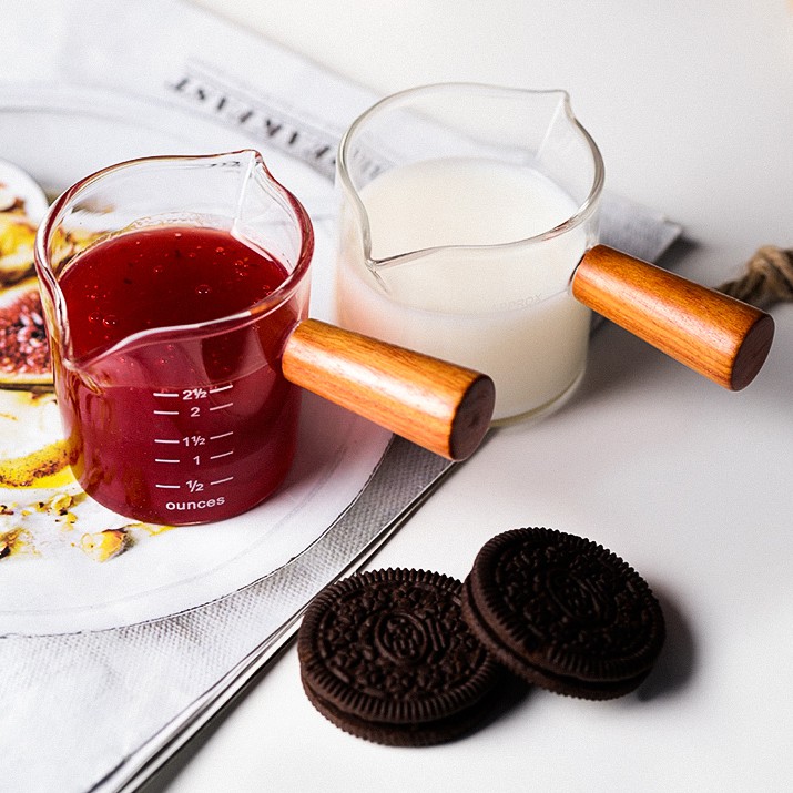Cốc đong espresso bằng thủy tinh hai miệng cầm tay bằng gỗ cách nhiệt free ship